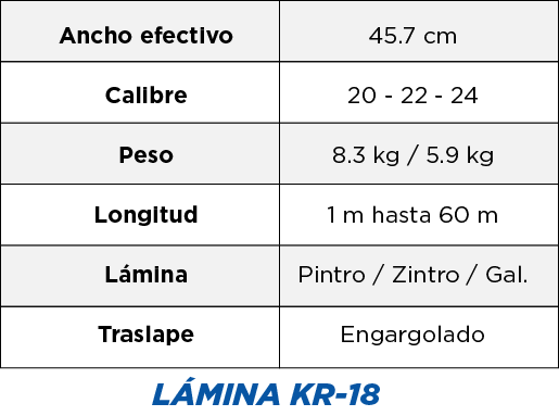 La lámina KR-18 se caracteriza por ser un perfil estructural de acero y un sistema de cubierta, se trata de un procedimiento versátil SSR acanalado y engargolado mecánicamente en obra.